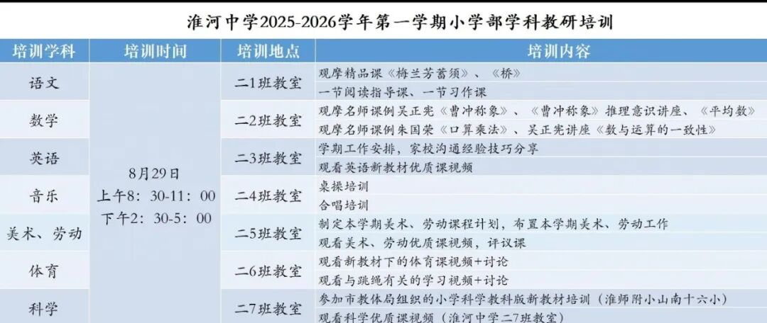 秋风送爽,学履不停。为深化课堂教学改革,提升教师专业素养与教学实践能力,为新学期教育教学工作赋能蓄力,8月29日,淮河中学小学部组织全体教师分学科开展了为期一天的全员教研培训活动。