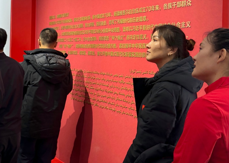 1600余幅珍贵图片、1400余件实物模型以及150余个多媒体视频和场景还原,让运动员们全方位感受在党中央坚强领导下,在全国各地大力支援下,新疆各族人民团结一心、艰苦奋斗、顽强拼搏所铸就的发展奇迹。这不仅是一次参观,更是精神力量的汲取。运动员们在观展中读懂历史,在共鸣中坚定信念。